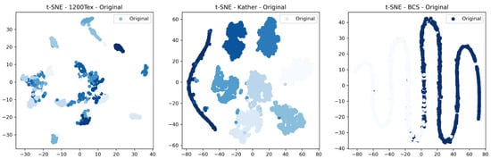 Figure 5 presents the t-SNE projections of the original training sets for the 1200Tex, Kather and Brazilian Coffee Scenes data collections. The t-SNE projection [68] is a very effective dimensionality reduction tool used to assess the quality of data augmentation methods [69,70,71,72]. They allow for a visual comparison of the distribution of the original training set with that of the augmented dataset, revealing how well the augmented samples capture the characteristics of the original input data.