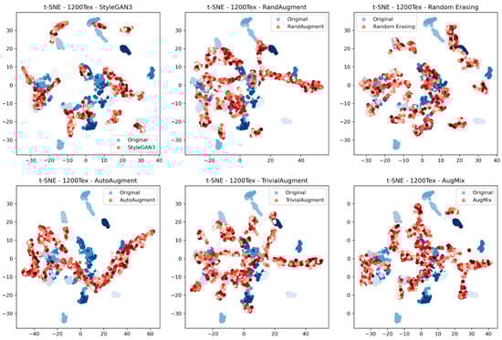 The t-SNE projections of all compared augmentation approaches for the 1200Tex dataset.