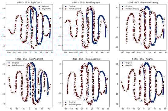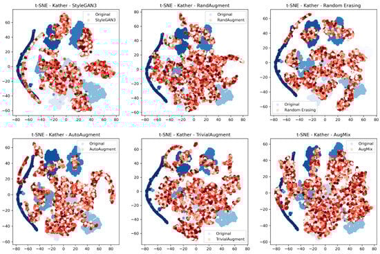 Figure 7 displays the t-SNE visualization of the six deep learning data augmentation approaches for the Kather medical dataset. Once again, the Conditional GAN-based approach, StyleGAN3, efficiently captured the original underlying training distribution, including the parabolic-like curve of ground-truth points located on the right side of the projection area. Random Erasing, while less accurate than StyleGAN3, comes closest to preserving the original projected data. The remaining augmentation approaches, however, struggle to separate clusters effectively, leading to more dispersed distributions throughout the entire visualization area.