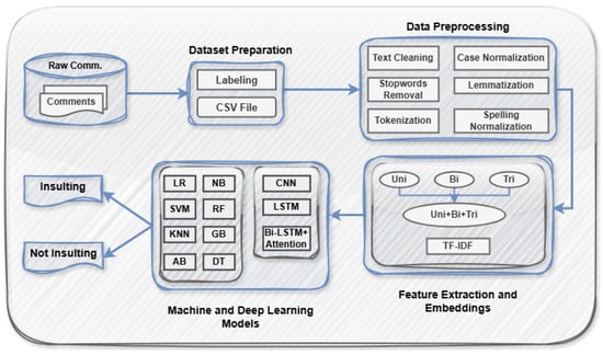 The methodology of this study encompasses the creation of a novel dataset, preprocessing techniques, feature extraction using TF–IDF vectorization, and the application of eight machine learning (ML) and three deep learning (DL) algorithms for insult detection in Roman Urdu text, as depicted in Figure 1.