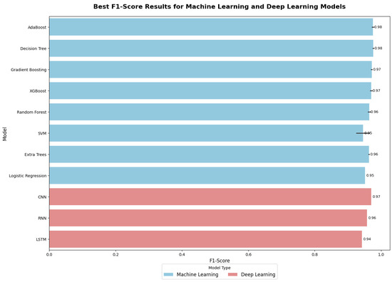 The top 10 ML results reaffirm the dominance of ensemble models, particularly AdaBoost and decision tree, with F1-scores of 97.79% and 97.78%, respectively, using the Uni+Bi+Trigram feature set (Table 10). Gradient boosting also performed exceptionally well (97.07%; Figure 2). These models effectively utilized the diverse feature representation provided by combining multiple n-gram levels, which allowed them to capture nuanced patterns in the dataset.