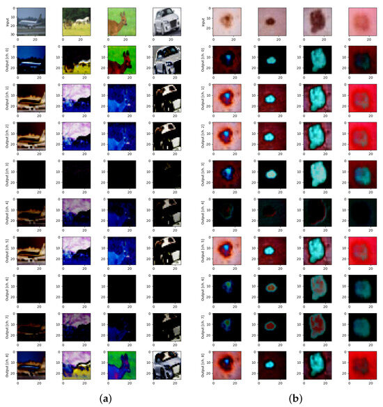 Y-axis quanvolutional transformation with stride 1 (Figure 1, in all rows except for the top one) was used among various possible quanvolutional operations that were described in details elsewhere [7,38] to create multi-channel quanvolutional input for image classification on CIFAR-10 (Figure 1a) and DermaMNIST (Figure 1b) datasets.