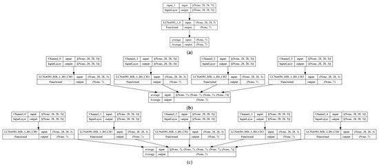 Figure 3. Examples of neural networks: (a) baseline with a single input channel (original image) and LCNet050 backbone, and (b) QC4 with 4 input channels (4 quantum preprocessed data) and 4 LCNet050 backbones, and (c) QC5 with 5 input channels (4 quantum preprocessed data + original image) and 5 LCNet050 backbones. - HNN-QC4: hybrid (quantum-classic) neural network (HNN)(Figure 3b) with multiple (actually 4) backbones of LCNet050 CNN with the 4 quanvolutional input channels (QC4);