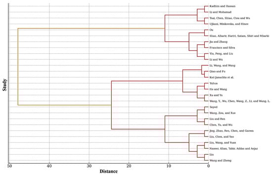 The dendrogram presented in the analysis visually represents the relationships between different studies based on their methodological approaches (Figure 2). The distances in the dendrogram were calculated using hierarchical clustering with the Ward linkage method, which minimizes the variance within clusters as new data points are merged.