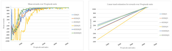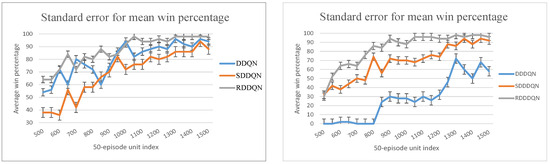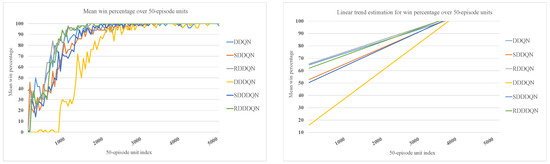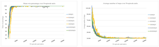 Figure 2), the weakest performance was observed for the DDDQN model, which had a very slow evolution in reaching a victory, as well as the least stable performance after reaching a 100% win rate. The remaining models had a comparable performance, with the best three scoring consistently close to each other: RDDQN, DDQN, and RDDDQN. DDQN and RDDDQN reached a 100% average during episode 1550, while RDDQN only did later at 1650, but the recurrent models showed less variability in their performance as training progressed. The stacked models had comparable results, with the dueling model outperforming its simple double counterpart only later in the training process.