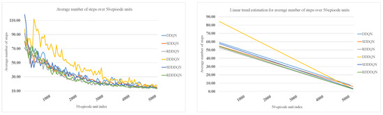 Figure 3. Similarly to the previous metric, DDDQN had the worst performance, having a high average, which pointed to most episodes finishing with a timeout for the first 2000 episodes; after episode 4000, the performance of this model nears that of the other five variants and long-term outperforms that of the non-dueling double models. In initial episodes, the stacked models had a significant improvement over all of the other variants, but as the training progressed, the recurrent models started to show less variability and a better performance, taking over the lead from the stacked models. The DDQN model had good results but showed the same oscillation as the DDDQN model at a smaller scale.