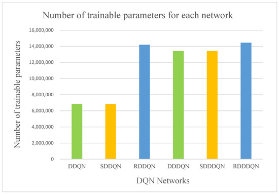 In terms of cost, the double-dueling networks have an increased size when compared to that of the double networks due to the decoupling of the value and advantage functions. In our case, the convolutional part of all of the networks has the same structure, and a difference appears in the second half of these networks: for dueling architectures, two dense layers are added to estimate the value and the advantage, and for recurrent networks, LSTM cells are added. Due to this, the most resource-intensive network is RDDDQN, followed by RDDQN, SDDDQN, and DDDQN, with DDQN and SDDQN having the lowest resource requirements [