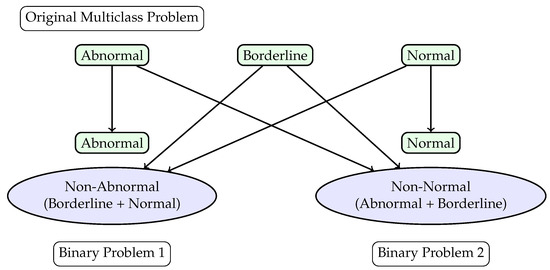 The hierarchical classification framework used for ECG signal classification is illustrated in Figure 1. This framework structures the problem into multi-class and binary classification tasks to enhance model interpretability and performance. The original multi-class problem involves categorizing ECG signals into three distinct classes: Abnormal, Borderline, and Normal. The dataset was distributed into 2248 “Abnormal”, 1451 “Normal”, and 651 “Borderline” patients. To address inherent challenges such as inter-class overlap and imbalanced data distribution, the classification problem is reformulated into two binary tasks as follows. Binary Problem 1: The Borderline and Normal classes are combined into a single Non-Abnormal class, which is contrasted with the Abnormal class. In this problem, there were 2248 “Abnormal” and 2102 “Non-Abnormal” patients. Binary Problem 2: The Abnormal and Borderline classes are merged into a single Non-Normal class, which is contrasted with the Normal class. In this problem, there were 2899 “Non-Normal” and 1451 “Normal” patients.