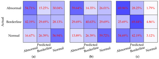 Comparison of normalized confusion matrices from (a) CNN, (b) DNN, and (c) LightGBM models. These matrices depict the results when models were trained to differentiate all three classes—abnormal, normal, and borderline.