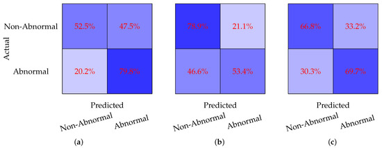 Results from Binary problem 1. Comparison of Normalized Confusion Matrices from (a) CNN, (b) DNN, and (c) GBC models, when the ‘Borderline’ and ‘Normal’ classifications are combined into classification ‘Non-Abnormal’.