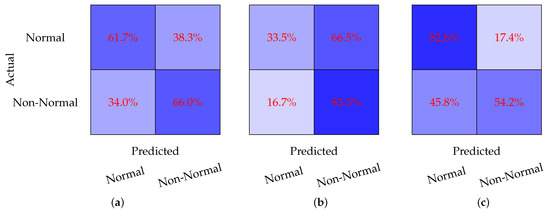 Results from Binary problem 2. Comparison of normalized confusion matrices from (a) CNN, (b) DNN, and (c) RF models, when the ‘Abnormal’ and ‘Borderline’ classifications are combined into classification ‘Non-Normal’.