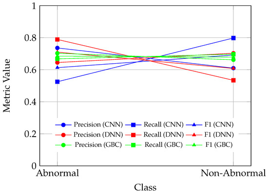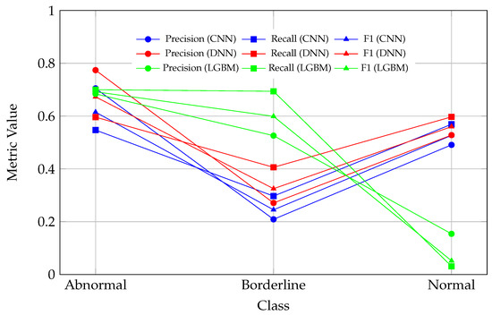 Line graph showing the per-class metrics (precision, recall, and F1 scores) for the three models (CNN, DNN, and LGBM) across three classes (Abnormal, Borderline, and Normal). The graph highlights the performance differences between the models for each metric and class.