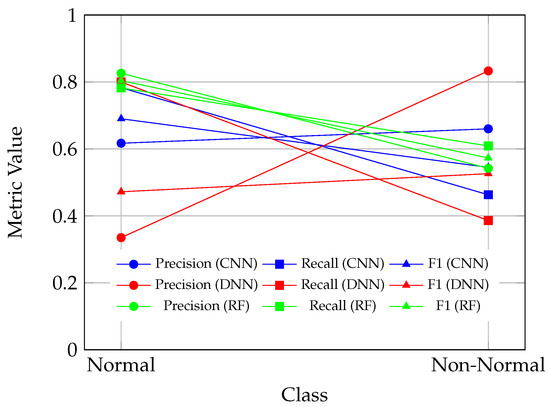 Figure 7 investigates the ability of CNN, DNN, and random forest (RF) models to distinguish between “Normal” and “Non-Normal” ECG signals (a combination of “Abnormal” and “Borderline” classes). The CNN model performs well in identifying “Normal” cases (recall: 78.3%; F1 score: 69.0%) but demonstrates weaker sensitivity for “Non-Normal” cases (recall: 46.3%; F1 score: 54.5%), underscoring its limited utility in detecting borderline or abnormal signals. The DNN model, while achieving high specificity for “Non-Normal” cases (precision: 83.3%), produces a low recall (38.6%), leading to an imbalanced F1 score (52.6%). This indicates that the DNN model is overly conservative when classifying “Non-Normal” cases, resulting in a high rate of missed abnormalities. The RF model, by contrast, demonstrates the most balanced performance, with an F1 score of 80.4% for “Normal” cases and 57.3% for “Non-Normal” cases, highlighting its clinical reliability in distinguishing between normal and non-normal ECG signals.