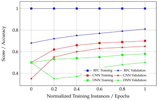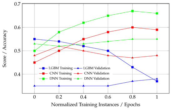 Unhealthy learning curves can manifest in several ways, each indicating issues with the model’s training and generalization. When there is an excessive gap between the training and validation curves, as observed in certain models, like DNN in Figure 8, this signifies overfitting. In such cases, the model performs well on the training data but fails to generalize to unseen validation data, suggesting that it has memorized the training data rather than learning meaningful patterns. Another problematic scenario occurs when the validation curve rises above the training curve (see DNN in Figure 9). This rare occurrence often points to data leakage or improper training and evaluation processes, where the validation set contains information from the training set. This leads to an artificially inflated validation performance, and such a model cannot be considered converged, as its performance on unseen data is likely to degrade significantly. Lastly, if either the training or validation curve fails to plateau, this indicates that the model has not converged. This could result from insufficient training epochs, suboptimal optimization, or an overly complex model architecture that struggles to adapt to the data. These issues highlight the importance of monitoring learning curves to ensure the proper convergence and generalization of ML models.