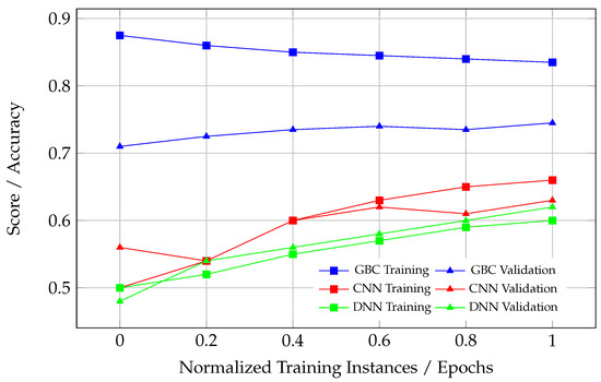 Learning curves for the binary classification task distinguishing Non-Abnormal (Borderline + Normal) from Abnormal ECG signals. The CNN model shows reasonably good performance with synchronized yet incomplete convergence between training and validation curves, suggesting mild overfitting but generalizability. The DNN model exhibits significant overfitting, with the training curve far ahead of the validation curve. The GBC model shows poor convergence, with both training and validation curves failing to rise together, indicating underfitting and limited learning.