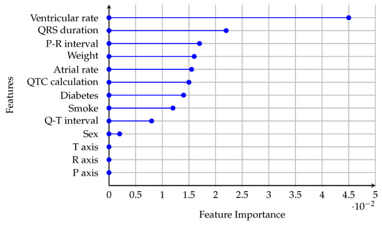 Feature importance in ML quantifies the contribution of each input feature to the predictive performance of a model. By identifying which features have the most significant impact on the model’s predictions, feature importance provides insights into the underlying patterns in the data and enhances the interpretability of the model. This is particularly valuable in clinical applications, such as ECG signal classification, where understanding the role of specific features can aid in diagnosing and managing medical conditions. The feature importance scores provide a ranked list of features based on their predictive power. For example, in the context of ECG signal classification, features like the QRS duration or ventricular rate may have high importance scores, indicating their critical role in distinguishing between normal and abnormal heart rhythms. Conversely, features with low importance scores, such as demographic variables like sex or weight, may have limited relevance to the classification task. Understanding these rankings allows clinicians and researchers to focus on the most informative features, potentially leading to more efficient diagnostic workflows and better-targeted interventions.