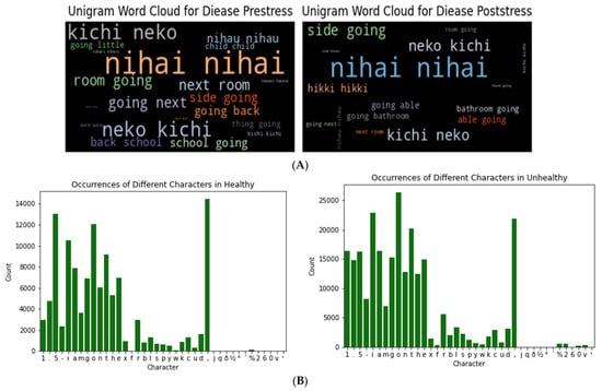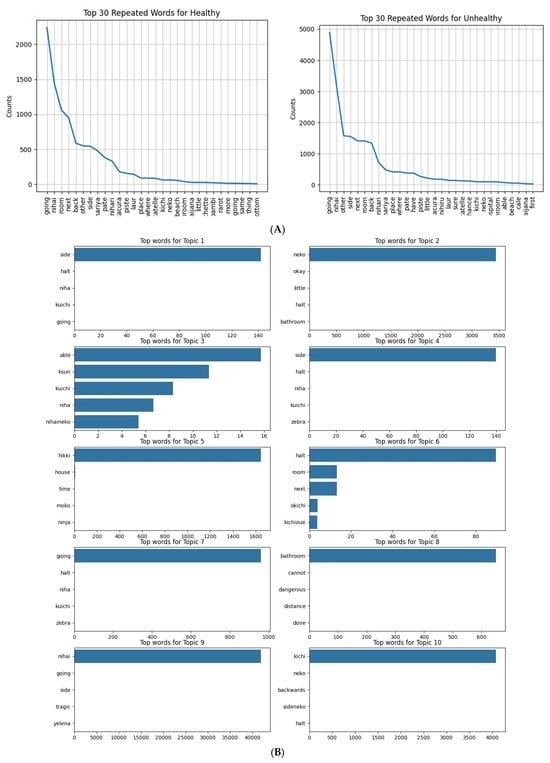 To determine whether these token patterns might form distinct clusters, we employed Latent Dirichlet Allocation (LDA). Topic modeling identified recurring sets of tokens that separated pre-stress from post-stress segments and healthy from unhealthy vocalizations. These “topics” significantly overlapped with repeated token fragments often associated with negative sentiment. Such clustering supports the notion that the same acoustic indicators leading to repeated text outputs also cause the model to group these transcripts into distinct “themes”. Even though the tokens themselves have no dictionary meaning, their distribution across topics reflects underlying acoustic conditions. Figure 3 (Panel B) shows an example of how repeated “nihai” sequences coalesce into a post-stress cluster, while more diverse tokens populate pre-stress or healthy topics.
