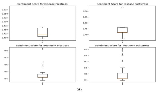 Comparative sentiment analysis showing differences between pre-stress and post-stress conditions (A) and among healthy, noisy, and unhealthy contexts (B), highlighting shifts in negativity corresponding to increased vocal intensity or distress.