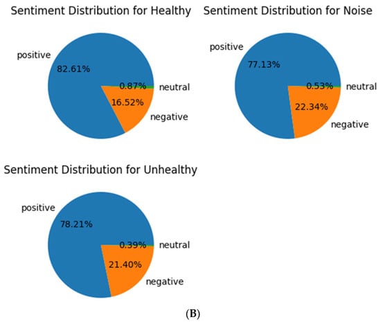 Recordings taken in noisy environments exhibited higher negative polarity scores than healthy ones, suggesting that Whisper’s repeated punctuation or foreign glyphs—prompted by background chaos—triggered the analyzer’s negative weighting. In “unhealthy” segments, the sentiment distribution was more variable; some clips approached strongly negative scores, possibly from coughing or labored breathing, while others remained closer to neutral. This variation (Figure 2) underscores the complexity of linking raw token repetition to highly heterogeneous physiological conditions. Still, across both datasets, elevated “negative” scores loosely tracked the presence of disruptive noise, stress, or health problems. It should be noted that the absolute sentiment values may be misleading but relative differences are informative.