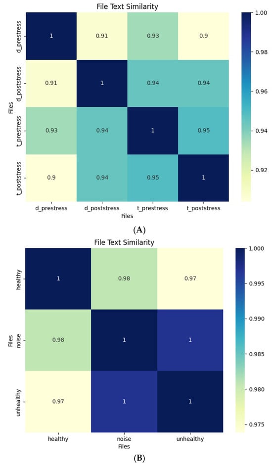 Cosine similarity heatmaps illustrating distinct clustering of Whisper-generated transcripts: Panel (A) differentiates post-stress or noisy vocalizations from baseline calls; Panel (B) demonstrates tight clustering among healthy recordings, confirming Whisper’s sensitivity to condition-specific acoustic patterns.