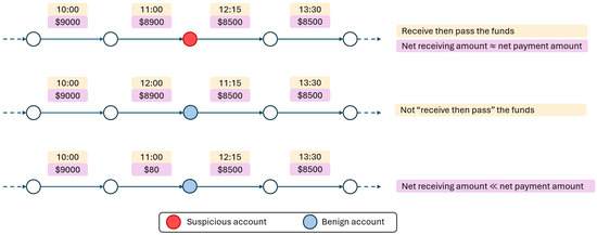 In addition, specifically for AML detection, identifying suspicious accounts by the relevant transactions depends on cash flow information. Nevertheless, such information may not be effectively captured by SOTA GNNs for digraphs such as DiGCN [7], MagNet [6], SigMaNet [5], FaberNet [4], and Dir-GNN [11]. As an illustrative example shown in Figure 1, suppose a series of path-like transactions exist in a transaction graph. The corresponding accounts can be considered suspicious when they serve as temporary repositories for funds [16]. Identifying these suspicious accounts requires identifying suspicious transactions, and identifying a suspicious transaction requires information from (past) receipt and (future) payment transactions, such as comparing the transaction time and the transaction amounts, to acquire the money flow information. Although stacking GNN layers allows information propagation, the edge-to-edge (transaction-to-transaction) information exchange is indirect and less detailed. Also, the first GNN message passing will be meaningless since raw edge (transaction) attributes are aggregated without comparing with other relevant transactions. Early propagation of edge (transaction) information and edge updates before the first iteration of GNN message passing can ease the learning of a GNN model for suspicious account detection.