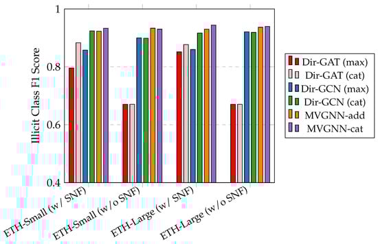 Since some datasets are very imbalanced, the F1 score for the illicit class is used for model performance evaluation, which is similar to what is used in real-world scenarios.