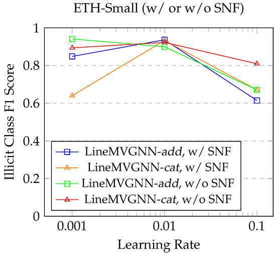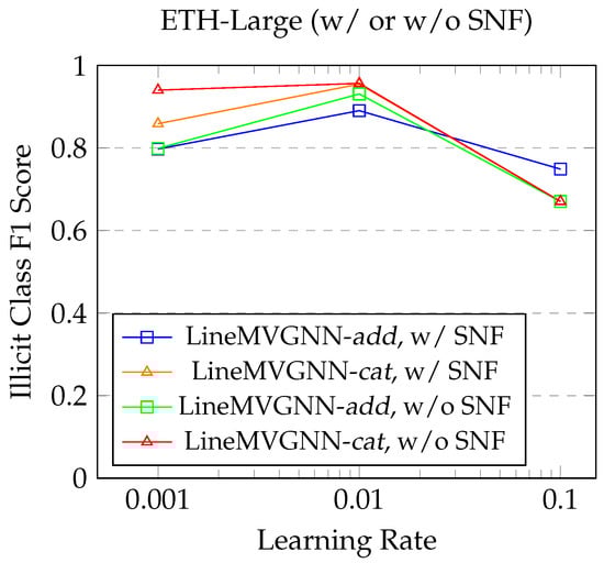 For the ETH-Small dataset (Figure 5) and the ETH-Large dataset (Figure 6), in general, the models achieve the highest F1 score for the illicit class at a learning rate of 0.01 regardless of the presence of SNF. A large learning rate of 0.1 leads to an unstable suboptimal performance, likely due to overshooting the optimal weights during gradient descent. Conversely, a small learning rate of 0.001 results in slower convergence and slightly lower performance in general. The models might have got trapped in local minima during training.