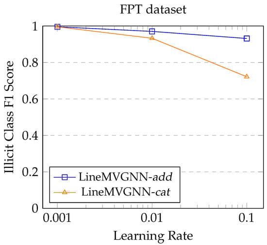 Comparing LineMVGNN-cat and LineMVGNN-add, although both variants exhibit similar behavior under the variation of learning rates, LineMVGNN-add is more robust to the variation of learning rate, especially when the transaction graph data is more complex. As shown in Figure 7 for the FPT dataset, although both variant models score over 0.99 for the illicit class F1, LineMVGNN-add’s performance degrades less noticeably than LineMVGNN-cat when the learning rate increases from 0.001 to 0.1. This reflects that LineMVGNN-cat, which combines messages from in- and out-neighbors via concatenation followed by a linear transformation, requires more careful tuning to ensure stable convergence. The linear transformation layer in LineMVGNN-cat introduces more learnable parameters, making the model more susceptible to oscillations or divergence if the learning rate is too high.