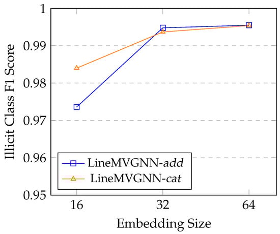As shown in Figure 8, we vary embedding sizes of 16, 32, and 64. The models achieve the highest F1 score for the illicit class with an embedding size of 64. An embedding size of 32 results in a significant drop in the F1 score, likely due to insufficient capacity to capture the complex relationships in the transaction graph. On the other hand, doubling the embedding size from 32 to 64 provides little improvement: and for LineMVGNN-cat and LineMVGNN-add, respectively. The results suggest that an embedding size of 32 or 64 provides a good balance between model capacity and computational efficiency for the FPT dataset, while avoiding the pitfalls of overfitting and excessive computational cost associated with larger embedding sizes.