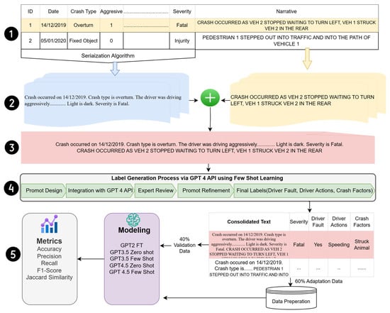 LLMs, such as GPT-3.5 and GPT-4, are particularly well-suited to this approach of MDF. These models allow for the generation of new labels, such as driver actions and crash factors, through few-shot and zero-shot learning, which significantly reduces the amount of training data required [19,23]. The fusion of tabular and textual data, combined with advanced NLP models, provides richer insights into traffic incidents, allowing for more accurate analysis and prediction of crash outcomes [51,52]. This study builds upon these advancements, introducing a novel MDF framework that leverages the latest generative models to improve crash analysis through zero-shot, few-shot, and fine-tuning learning experiments [19,23].