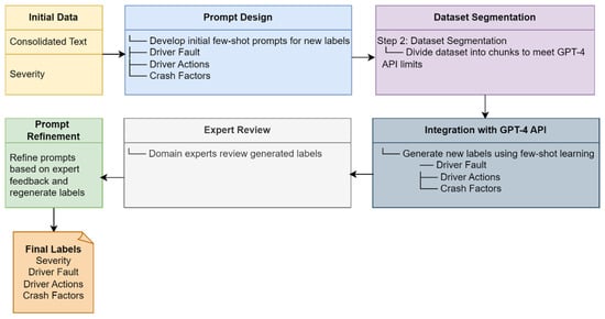 One of the most significant challenges in this domain is the scarcity of labeled datasets, which hampers the development of robust supervised machine learning models. This scarcity is a key barrier, as labeled data are crucial for training models that can accurately predict and classify traffic incidents. To address this, GPT-4’s few-shot in-context learning is employed to derive new labels from hybrid multimodal traffic crash data, effectively overcoming the challenges posed by limited labeled datasets [16,19]. The newly generated labels, such as “driver at fault”, “driver actions”, and “crash factors”, are then validated by domain experts to ensure their accuracy and relevance. These labels play a critical role in providing a more detailed and nuanced understanding of traffic incidents, which is essential for identifying faults, assessing driver behavior, and understanding contributing crash factors. Such insights are vital for developing targeted road safety interventions and improving overall traffic safety [20,21,22].