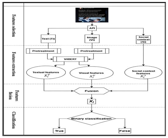 - Feature selection of the tweet: this stage involves extracting features from the tweet based on three modalities: text (), images (), and the structured features of the social context ().