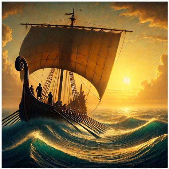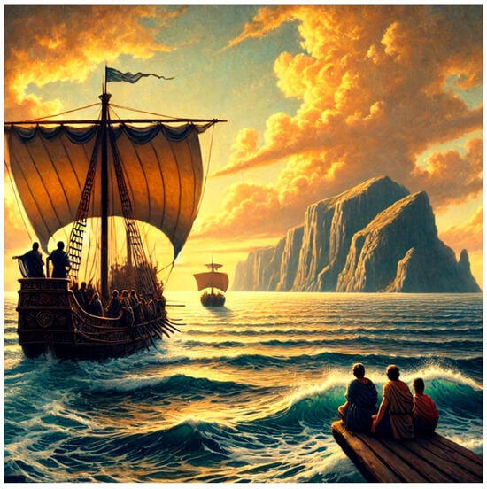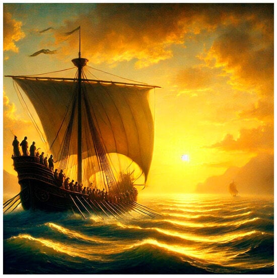- Observing the initial image produced, it is firstly found that a nautical landscape was rendered in the visual representation which was derived from the verb “Πλέομεν”, which denotes a naval voyage. The aesthetics of the image refer to an ancient type of ship with people dressed in ancient clothing. The attribution of the era is not precisely described in the prompt; therefore, it was probably calculated either because of the use of an ancient language or because of the original explanations given for the use of this text, or because of the reference to the ancient unit of measurement of “stadia”.
