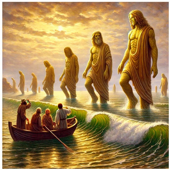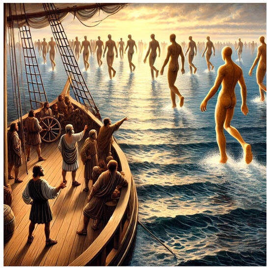 The final part of the text assessed whether DALL·E could visually represent emotions described in Ancient Greek. The prompt “Θαυμάζομεν οὖν ὁρῶντες…” (“So, we are surprised to see them not sinking but staying on the waves and walking without fear.”) tested the AI’s ability to convey expressions of wonder and disbelief on people and lack of fear on fictional creatures.