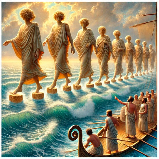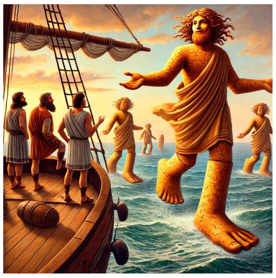 The second part of the text focused on the AI’s ability to combine real and fictional representations within the same visual output. The prompt, “…καθορῶμεν ἀνθρώπους πολλοὺς ἐπὶ τοῦ πελάγους διαθέοντας… ταῦτα γὰρ φέλλινα ἔχουσιν·” (“…we distinguish many people running here and there on the sea, who resembled us in all things… except their legs, which were made of cork.”) tested whether DALL·E could realistically integrate mythological elements into a rather natural setting. In this case, in addition to the initial order, a second supplementary order was given to improve the result.
