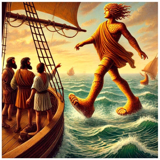- As in the previous case, the natural landscape was accurately rendered by representing an ancient type of ship with people dressed in a way that refers to our perception of antiquity. It also seems to have correctly understood the verb in the sentence “καθορῶμεν”, which suggests that the people were looking at and observing the imaginary creatures because the representation of the human figures gives the sense that they are looking with curiosity and the posture of their bodies indicates that something outside the ship has caught their attention. It also correctly perceived the meaning of the participle “διαθέοντας”, meaning they were walking on the surface of the sea.