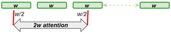 Transformer LS [15] aggregated the local attention around a smaller window (sliding window), with a projection of the full sequence attention to a smaller size, so that we can efficiently handle long sequences without the quadratic attention complexity. For short attention, the approach here is to use a segment-level sliding window attention, where the input sequence is divided into disjoint segments with length w (e.g., w = 128, and sequence length is 1024). For non-autoregressive applications, all tokens within a segment attend to all tokens within its home segment, as well as w/2 consecutive tokens on the left and right side of its home segment (zero-padding when necessary), resulting in an attention span over a total of 2w key-value pairs. This is depicted in Figure 1.
