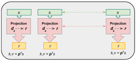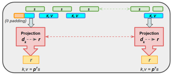 The compression is performed on the feature dimension initially through a projection with dimensions, p → ( d k   ×   r ), where d k is the embedding dimensionality and r is the target length. The dynamic projection matrix ‘ P i ’ is computed by multiplying p with n length key ( K ) → ( n × d k ) where ( r n ) ,   i.e., ( K × p ) . This product results to ‘ P i ’ with dimensions ( n × r ) . The transpose of this projection matrix P i T is applied to the key vector → ( p T   ×   K ) . This product results in a modified key ( K ) ¯ , with dimensionality → ( r × d k ) thereby compressing its sequence length. Similar compression is performed for the value vector as well. This is a standard dimensionality-reduction technique illustrated in Figure 2 and is used in popular models like Performer and Transformer LS.
