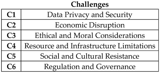 Between August and November 2024, an in-depth study was conducted to examine the societal implications of various challenges arising from the development and increasing use of artificial intelligence (AI) technologies. A list of six key challenges was compiled by reviewing answers generated by ChatGPT, cross-referencing online sources, conference proceedings, journal articles, and consulting academics from several European countries and the USA. The selected challenges, presented in Figure 1, are listed in no particular order, without any preference or ranking. Brief descriptions of each challenge are as follows: