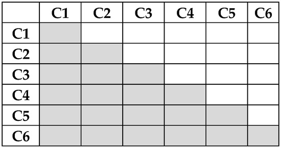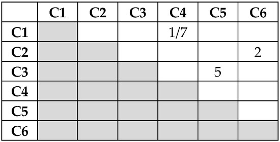 The following explanation was provided to humans on how to fill the matrix (see Figure 3): If an individual considers that challenge C3 is strongly more important than challenge C5, the number ‘5’ should be inserted into the cell (C3,C5). If C4 is strongly more important than C1, then ‘1/7’ should be inserted in the cell (C1,C4). If an individual considers that challenge C2 is slightly more important than challenge C6, then ‘2’ should be inserted into the cell (C2,C6), etc.