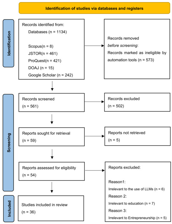 In the identification stage, systematic searches were conducted in major academic databases (e.g., PubMed, Scopus, Web of Science) to locate the scholarly literature addressing the application of LLMs in entrepreneurship education. Studies focusing on general education or business activities rather than entrepreneurship education were excluded, as they did not align with the objectives of this study. To ensure a comprehensive and balanced analysis, various types of studies—including quantitative, qualitative, mixed-methods research, and literature reviews—were incorporated.