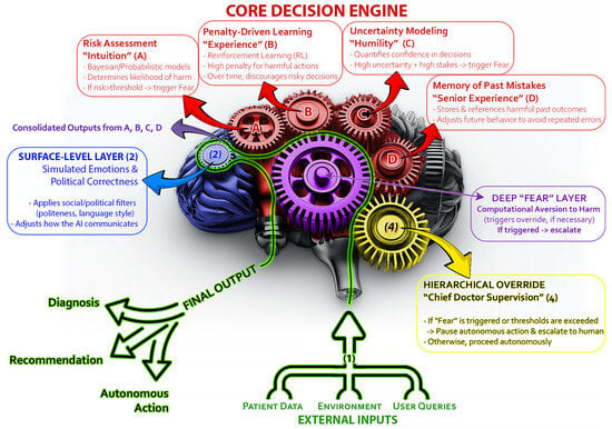 We must distinguish between simulated fear (surface-level algorithms) and the idea of a genuine fear mechanism that influences system-wide decision-making. To implement metaphorical “fear” as a part of the core decision engine of AI medical agents (Figure 1), subsystems of the “Fear Mechanism” shall be understood.