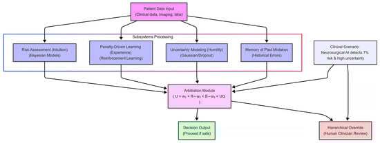 Imagine a neurosurgical AI assistant evaluating whether to recommend clipping an intracranial aneurysm. The AI uses its risk assessment module to compute the probability of catastrophic bleeding and its uncertainty modeling to assess confidence in its prediction. Suppose the system determines a 7% risk—above the safe threshold—and finds significant uncertainty due to atypical patient anatomy. Drawing on past experiences stored in its memory and reinforced by penalty-driven learning, the AI’s fear module activates. Instead of automatically recommending surgery, it flags the case for human review. The neurosurgeon can then consider the AI’s warning alongside their own judgment to decide on the best course of action.