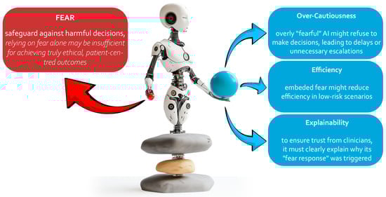 Human oversight of medical AI agents is a probable scenario for the next decade, which might be different from military AI systems. In general, most studies emphasize the importance of human oversight and final decision-making authority for medical AI [25]. Fully autonomous emotional AI may not be appropriate in high-stakes medical contexts. Implementing emotional states or fear in AI raises complex ethical questions about machine consciousness and the nature of AI decision-making [26]. A more pragmatic, risk-sensitive approach focused on safety may be more suitable. Current regulatory frameworks are not adequate for emotionally aware or highly autonomous medical AI [16,27]. Dissemination of AI to medical fields along the pipeline of radiography [28] resulted in the necessity for ethical frameworks [29]. Risk-averse implementations may be easier to regulate and validate. High-stake AI agents not exclusively deciding matters of life and death are relevant for consideration of subjective emotion-like frameworks. For example, treatment planning employing subjective views includes facial evaluation for aesthetics [30,31], sensitive rare genetic disease detection [32,33], or nuances for patient compliance coaching [34].