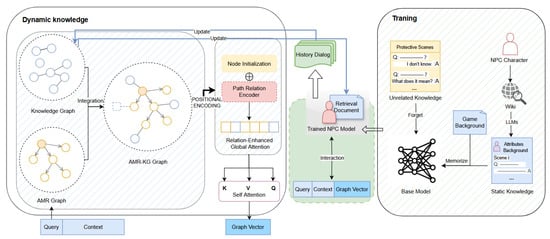 In summary, our proposed approach first fine-tunes the NPC language model. During interaction, it parses the player’s input text using Abstract Meaning Representation (AMR), integrates it with the short-term memory knowledge graph to construct an AMR–KG graph, and then prunes the graph. The pruned AMR–KG is fed into the language model, which retrieves relevant information from the vector-based long-term memory to generate the final personalized response.
