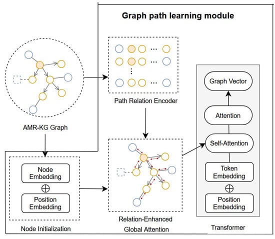 This module is a graph path learning method based on a relation-enhanced attention mechanism, implemented as shown in Figure 5. It primarily initializes the concept node vectors in the AMR–KG graph using GloVe [] word embeddings and absolute position embeddings. In the relation encoding stage, we refer to Cai’s [] graph relation path reasoning method, employing a recurrent neural network with Gated Recurrent Units (GRUs) to encode the relationship between two concepts in the graph as a distributed representation. Specifically, the forward GRU and backward GRU process the forward and backward information of the relation path, respectively, as shown in the following formulas: