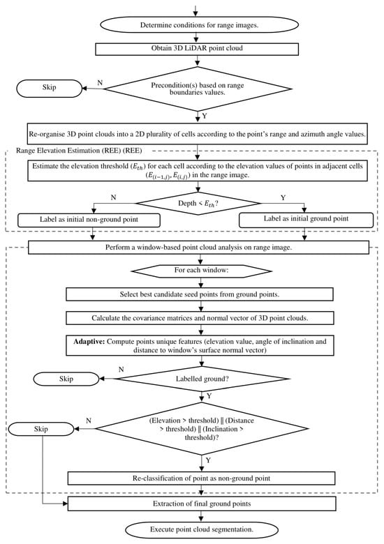 The REE coarse segmentation techniques result in a high level of over-segmentation of ground points, as observed in Figure 3. This is understandable because all valid points within the range image are labelled as ground points before the elevation threshold is used to segment non-ground points. To address this, the window-based model fitting technique is employed to adaptively calculate the unique spatial and geometric features of each point in a predefined region/window size which is a subsection of the entire range image, as shown in Figure 4 and Algorithm 2. This window is traversed across the column, and the spatial and geometric features for each point within the current window are re-calculated. These values are updated in the data structure and used to perform a fine-grain segmentation of the initially segmented points in the point cloud.