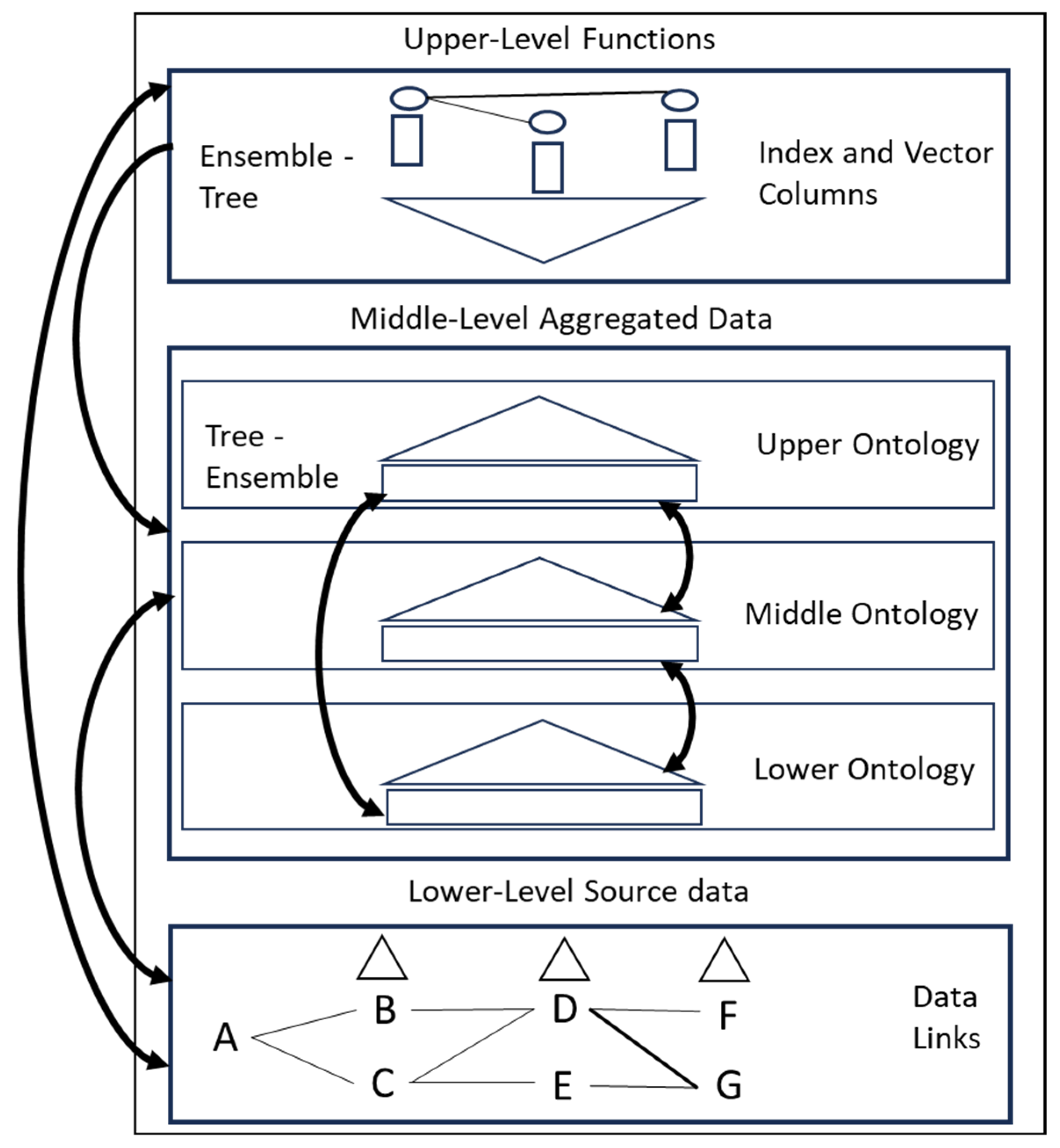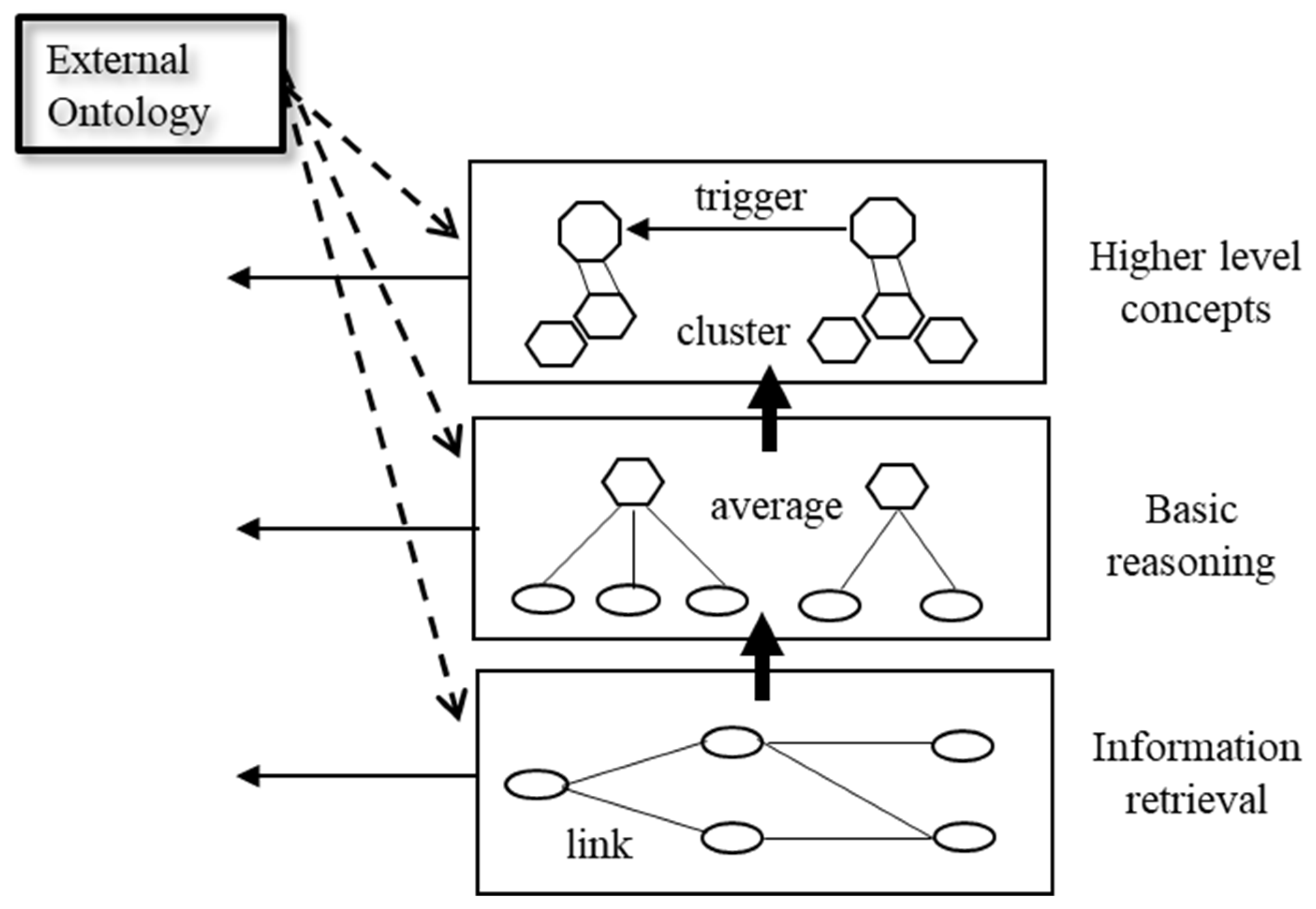 - The middle level is an ontology that aggregates the source data through three phases and this converts it from set-based sequences into type-based clusters.