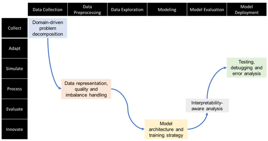 Each element of the proposed computational-thinking framework is paired with a stage of the data-science pipeline and an AI-driven Bloom action [26], as illustrated in Figure 1. Domain-driven problem decomposition anchors the framework because, like the Data Collection step and Collect level, it clarifies the business question and what information must be gathered and organized before any modeling can begin. After data are collected, data representation, quality control, and imbalance handling align with Data Preprocessing and the Process level because they transform messy inputs into well-structured tensors. Model architecture and training strategy correspond to Modeling and the Innovate level; selecting layers or loss functions demands creative experimentation, exactly the kind of higher-order thinking Bloom labels as innovation. Interpretability-aware analysis fits Model Evaluation and the Evaluate level because judging feature importance requires critical analysis of a model’s reasoning. Finally, testing, debugging, and error analysis map to Model Deployment and the Simulate level because running controlled tests and monitoring in a staging environment help identify failures before the model serves real users. A list of recommended activities, such as lectures, hands-on programming, and discussions, is presented in Table 1.