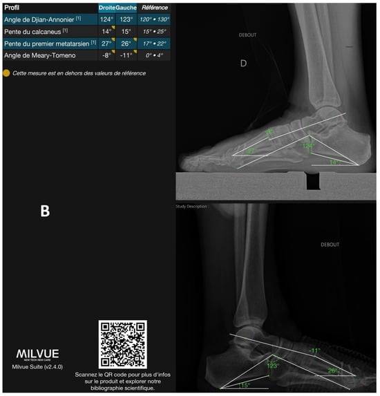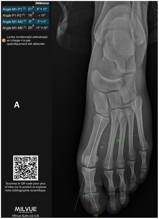 Example of a radiograph analyzed by the deep learning model with all annotated angles. (A): Frontal view. (B): Lateral view. The software output includes a prompt to scan the QR code for more information about the product and to explore related scientific publications, directing to the following URL: https://product.milvue.com/fr/?content=cD1jZSZ2PXYyLjQuMA%3D%3D (accessed on 5 June 2025).